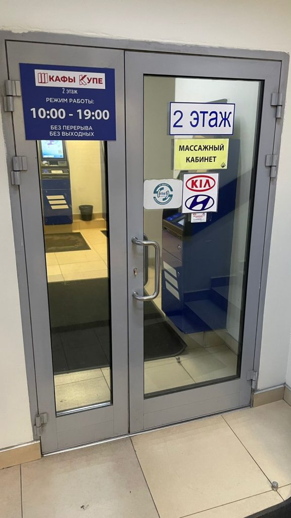Для входа в здание нужно воспользоваться крыльцом с левой стороны здания и стеклянными дверями.