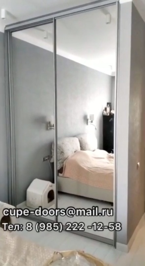 Мини гардеробная в спальне с высокими потолками. Две зеркальные двери