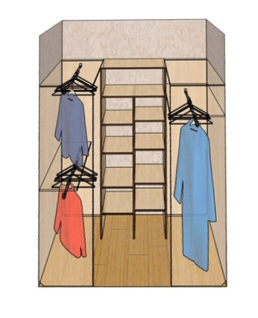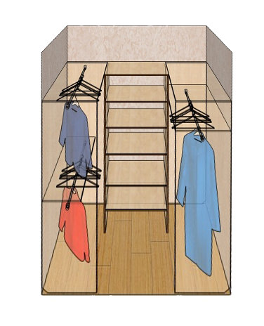В сущности, никаких ограничений на выбор стеллажей данная схема планировки не предполагает, да и к наполнению серьёзных требований здесь нет. Владелец помещения сможет обставить П-образную гардеробную по своему вкусу и усмотрению.